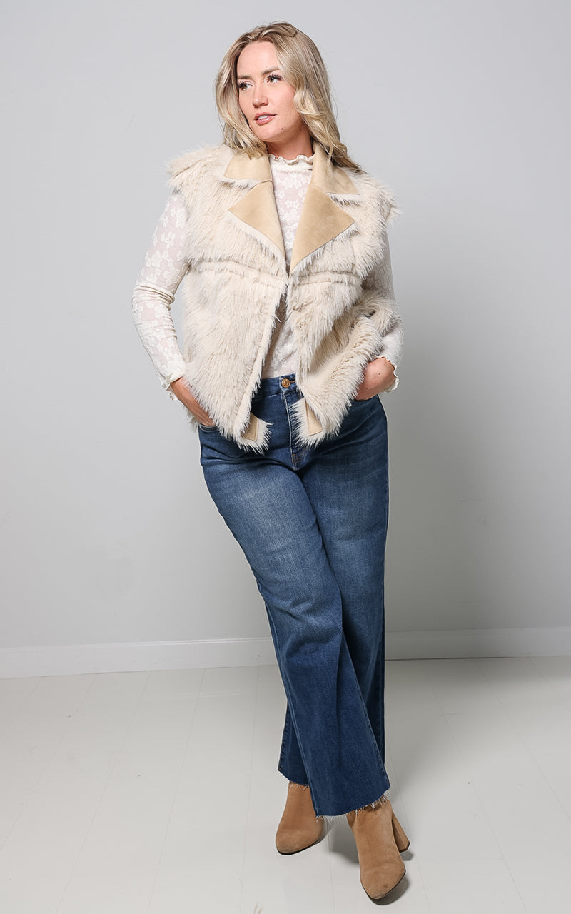 Elevate your style with this chic and cozy faux fur trim vest. Crafted from high-quality materials, this sleeveless reversible vest features a plush faux fur collar and trim that add a touch of sophistication to any outfit. Perfect for layering, its versatile beige color complements a variety of looks, making it a must-have addition to your wardrobe. Pair it with jeans for a casual yet stylish ensemble, or wear it over a dress for a touch of elegance. Stay warm and fashionable with this stunning faux fur trim vest.